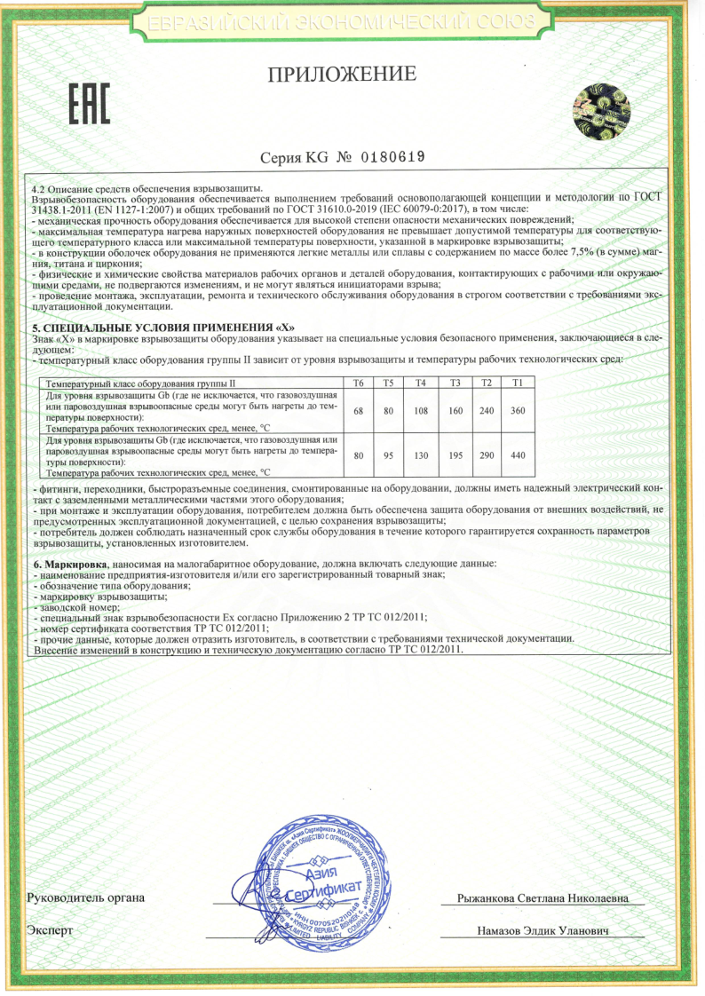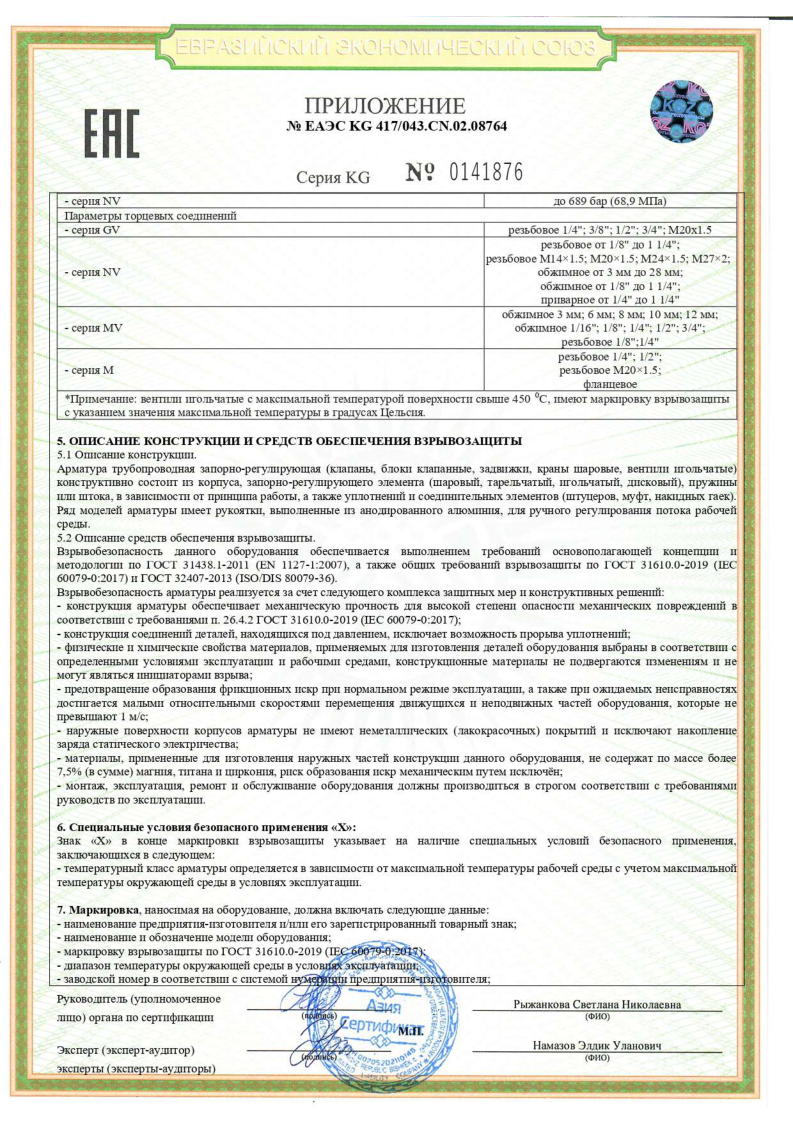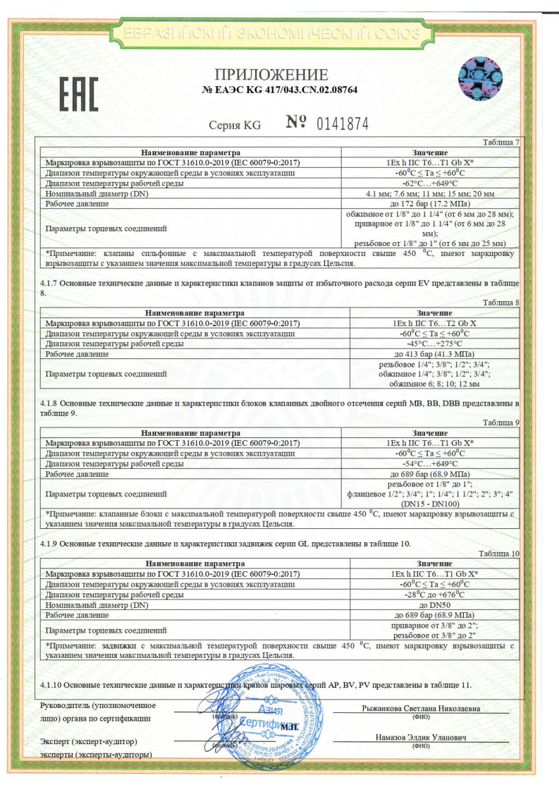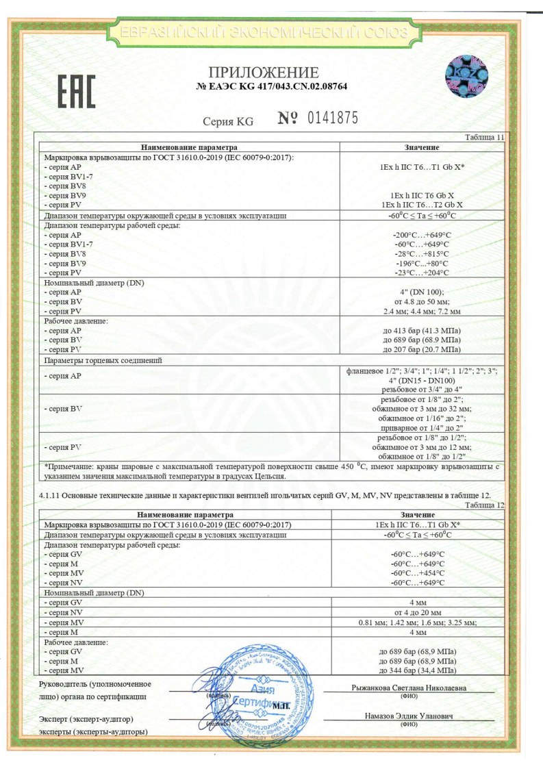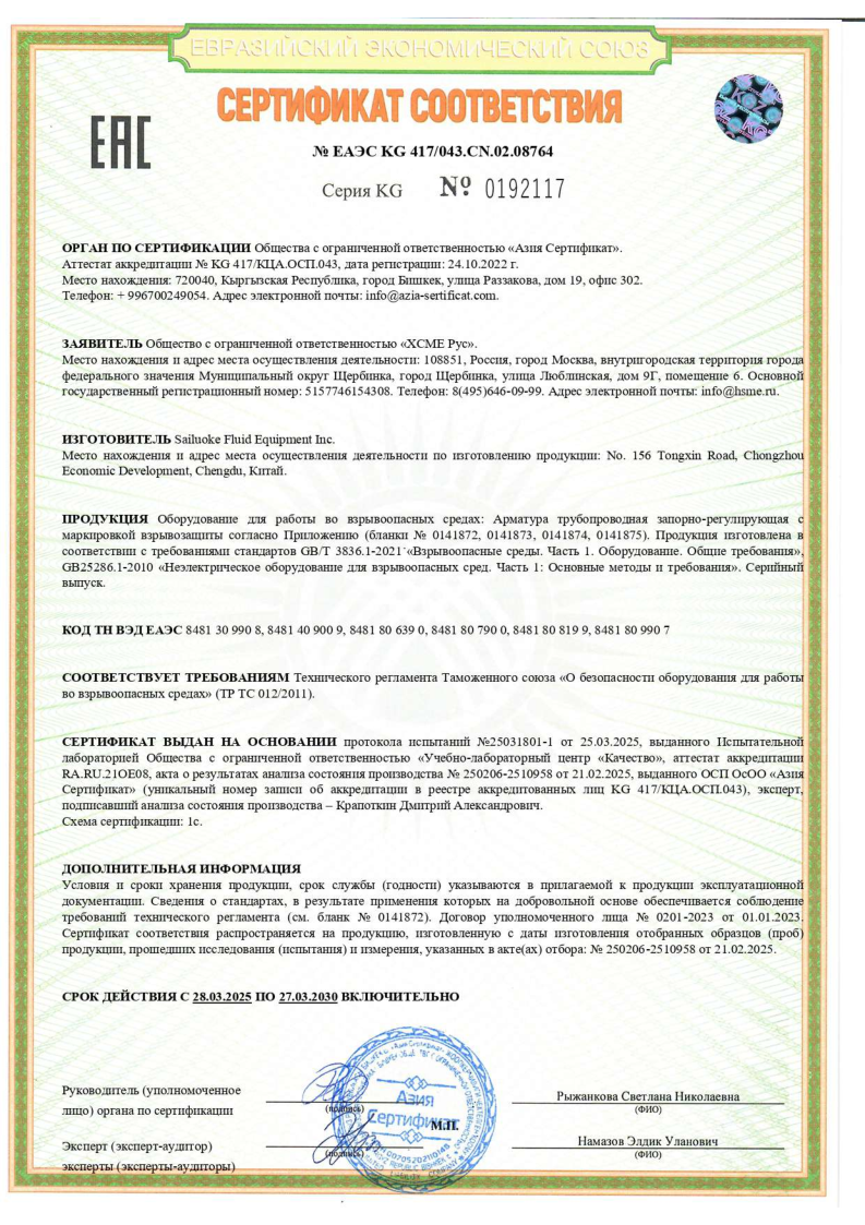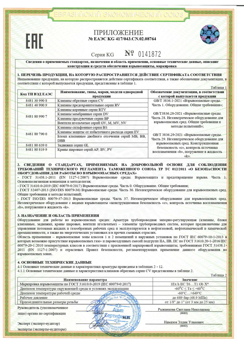 Сертификат соответствия ТР ТС 012 на арматуру BV,NV,RV,MV,BS,DV,CV,DBB,BP