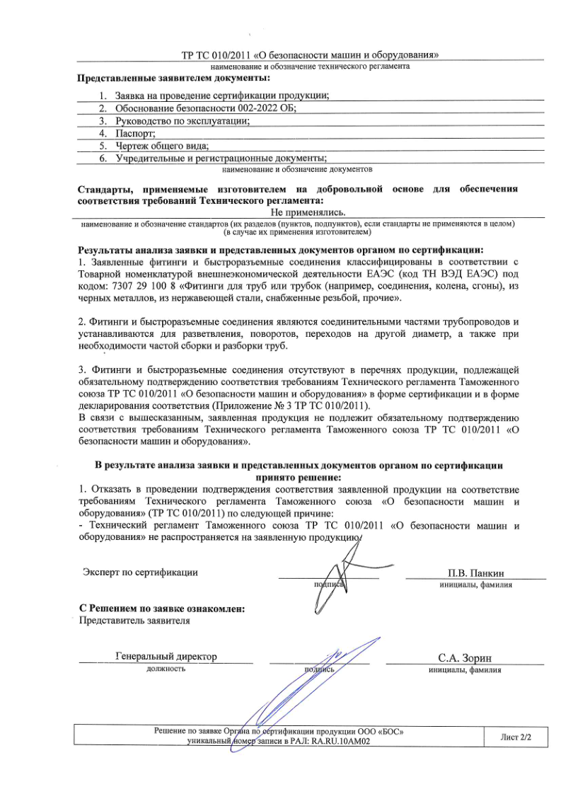 Отрицательное решение ТР ТС 010 фитинги,БРС