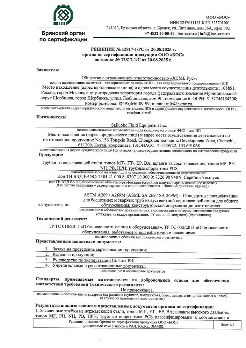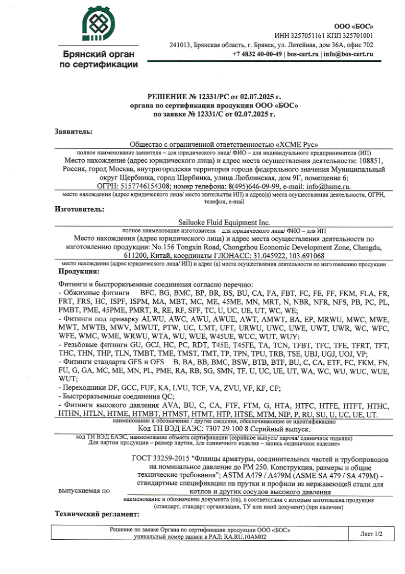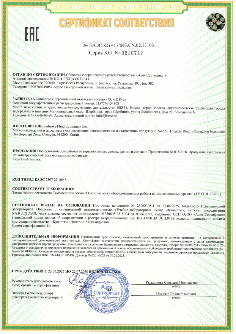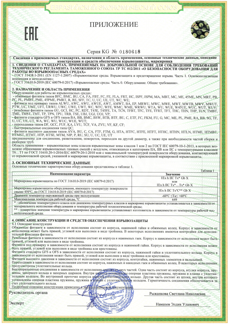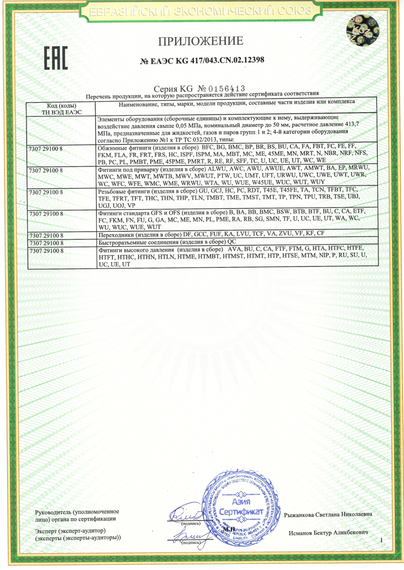Сертификат соответствия ТР ТС 012 на фитинги, БРС